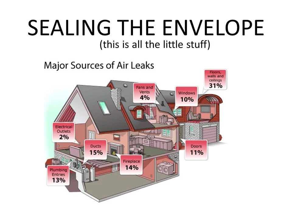 Energy retrofits generally involve air sealing and insulating the building envelope (the surfaces that separate outdoors from indoors) to reduce the demand for heating and cooling. “Contemporary low-energy homes do not waste heat and strive to block airflows that carry water through any gaps in the weather shell.” (Passive House Details, p.5)